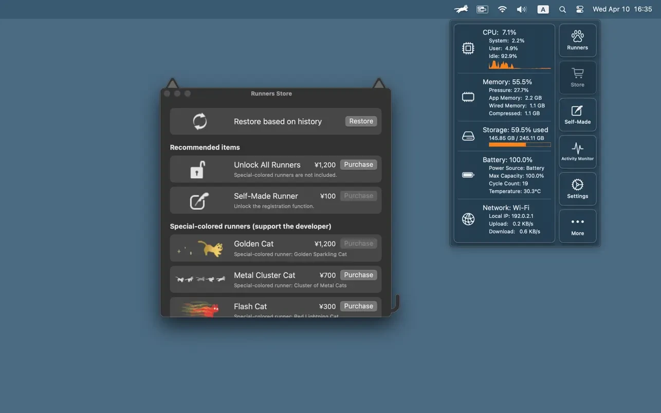 RunCat — 动态的 macOS 菜单栏系统监视器。该应用通过一只奔跑的猫来直观地评估系统的负载情况。